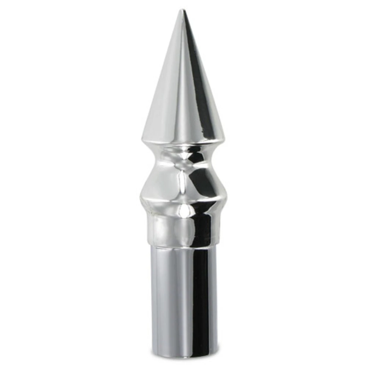 This round spear is made of metal and measures 3.5 inches x 1.5 inches. It is coated in a shiny silver and comes with a ferrule. It is to be used with indoor wooden poles.