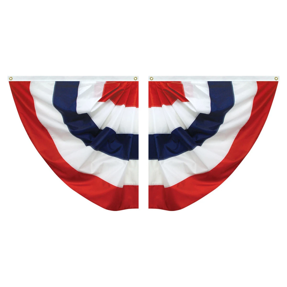 This set of two 3′ x 3′ Half Pleated Nylon Fans will be the perfect outdoor decoration at your home or office! The are fully sewn with a canvas header and brass grommets. These pleated fans do not have stars. Measures: 3′ x 3′.