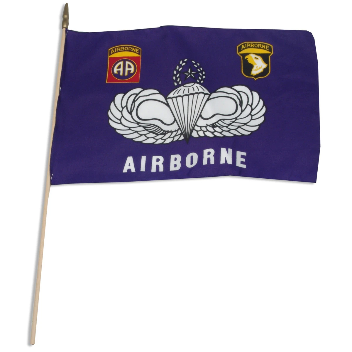Airborne Flag 12″ x 18″ suitable for parades and veterans graves. Higher quality than you can find anywhere! Most flags this size are printed on coarse fabric and have cut edges. Our 12″ x 18″ stick flags are nicely printed onto quality polyester fabric and sewn around the all edges. Most have a sewn pole sleeve, which is use to mount them to the 24 inch wood stick*. *Note: Depending on availability some flags may be stapled to the wooden stick. The flag quality however, will be to the highest standard.