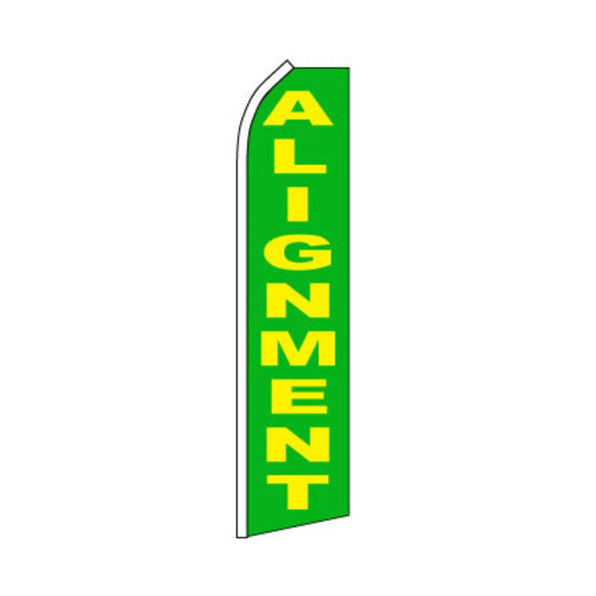 Draw attention to your wheel alignment services center with this large Alignment Swooper Flag hoisted outside the entrance! Measuring 11.5 x 2.5 feet, this swooper flag carries text in bright yellow font. This knitted polyester blade flag flaps in the wind and can be seen from a distance. It also has a sewn sleeve that allows a specially designed flag pole to slip in easily.