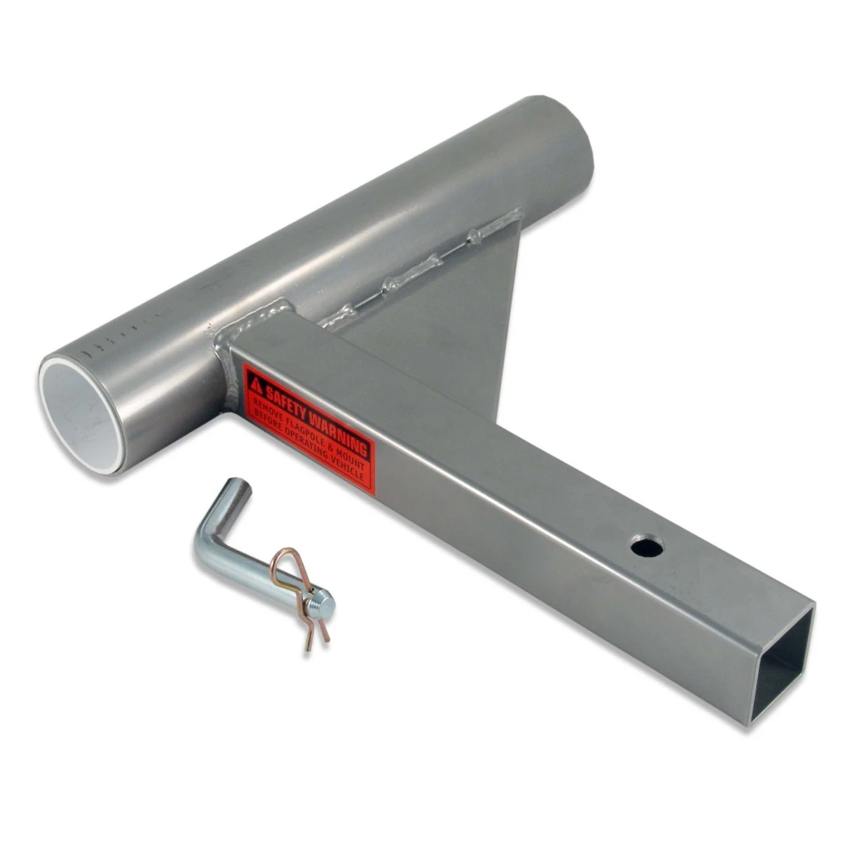 Aluminum Trailer Hitch Mount fits pole diameters of 2 1/4″ and 2 1/2″. A great way to show your team spirit or celebrate at any tailgate party. Fly a flag from your car, truck or RV trailer hitch. Easy installation by sliding the mount into the receiver. Lock into place with the pin. Vehicle must be stationary for installation and use. It is for Standard 2″ Square Reese Receiver Hitches.