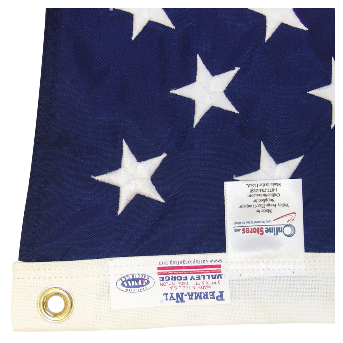 Valley Forge is one of the leading suppliers of American flags in the United States and have been a long-standing supplier of flags to the Federal Government. The American Flag 3 ft x 5 ft Sewn Nylon by Valley Forge Flag is made of a wonderful sewn nylon that is durable, vibrant and is one of our most popular sizes and choices for an outdoor flag. Sewn nylon allows for this flag to fly majestically through the air with only a light breeze and low wind. This ensures that you will get to see Old Glory in all ‘er glory in most residential and commercial areas that don’t typically get too much wind. Featuring sewn stripes increases the longevity of this flag and keeps it resistant to fading and fraying. Couple this with sewn nylon which holds its own against moisture and exposure to the sun, you got a powerhouse of a flag that is made for outdoor use and to be right at home just outside of yours. These flags look great indoors as well and have embroidered stars that are an eye-catching delight. The American Flag 3 ft x 5 ft Sewn Nylon by Valley Forge Flag also has brass grommets and a strong header to keep your flag waving from your flagpole for many seasons to come.