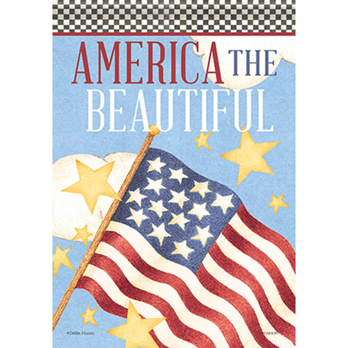 An excellent way to welcome visitors, this patriotic flag adds a colorful, welcoming touch to your home. The decorative flag features a bright stars, an American flag, and a ‘America the Beautiful’ message written across it with a bright and colorful background and detail that complement the overall design. The flag measures 28″ x 40″.