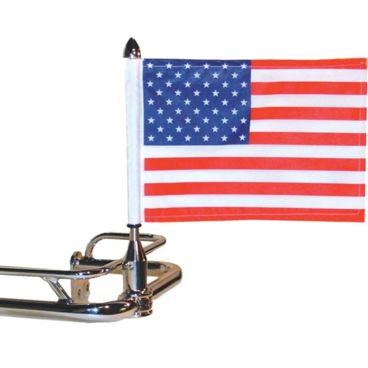 This Fixed Motorcycle Flag Mount is designed to fit on the 3/4″ round saddlebag bars that are found on Harley FLs, it will fit both the Nostaglia bar and the regular double bar. This flag mount comes with a 9″ pole, 6″ x 9″ American flag and allen keys for easy installation.