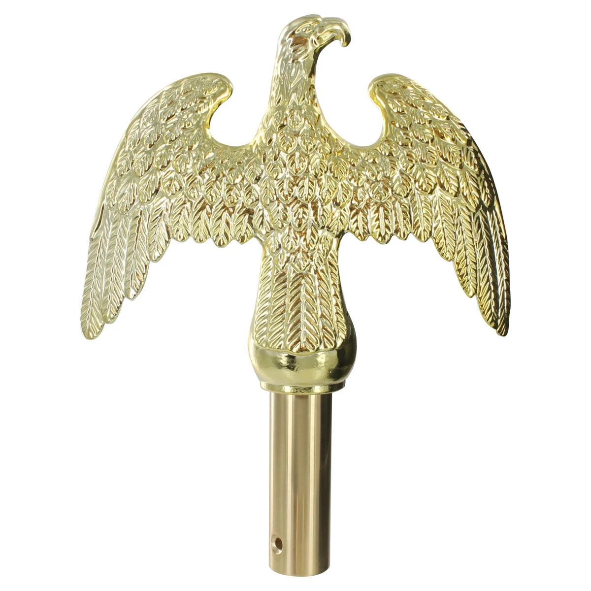 Metal Gold Eagle with a height of 6 inches and a wingspan of 7.25 inches. Comes with a ferrule to fit 1.25 inch for INDOOR poles. ONLY fits the indoor oak poles and will not fit the indoor metal (telescopic) poles.Please Note: the 1.25″ pole needs to have a 7/8″ tapered end.