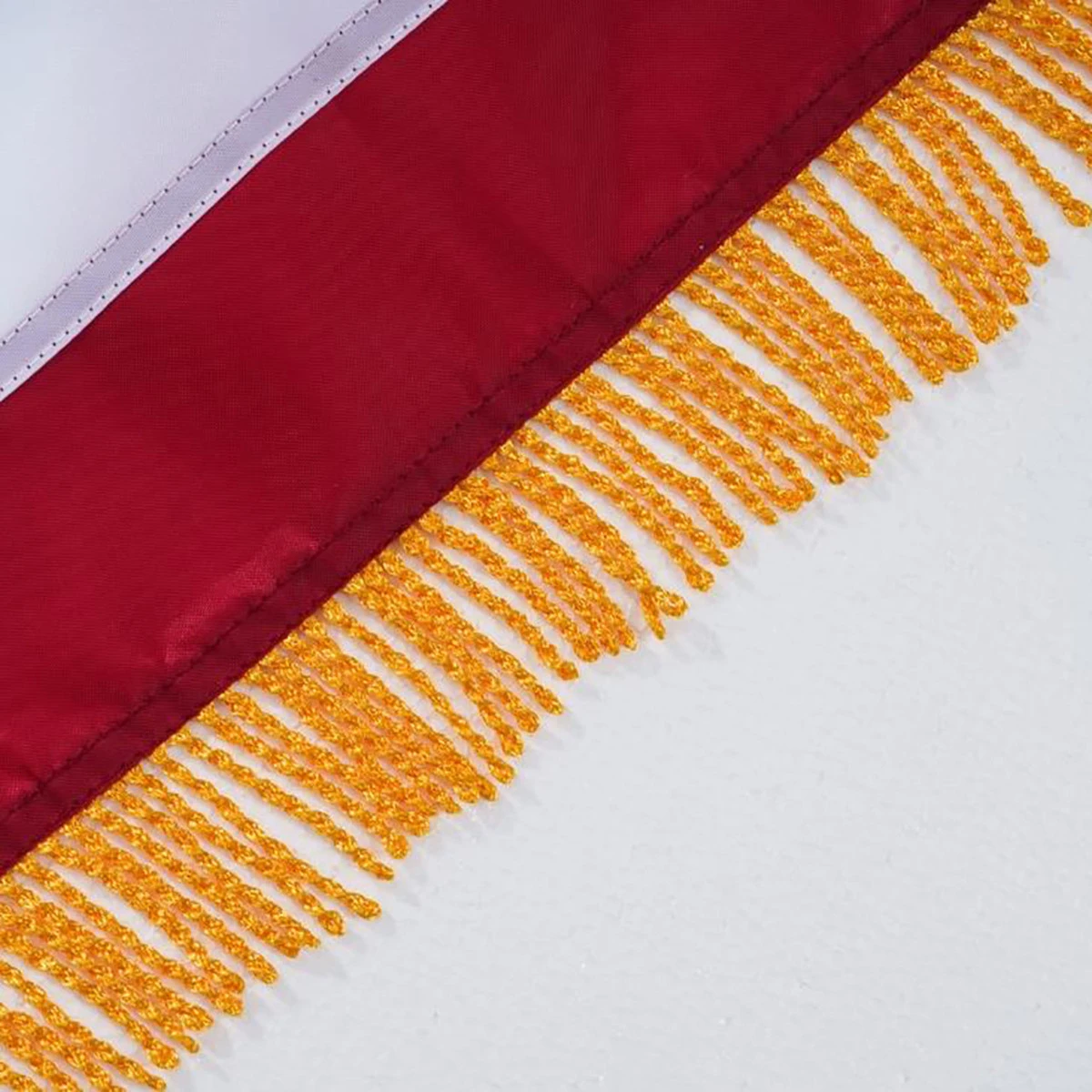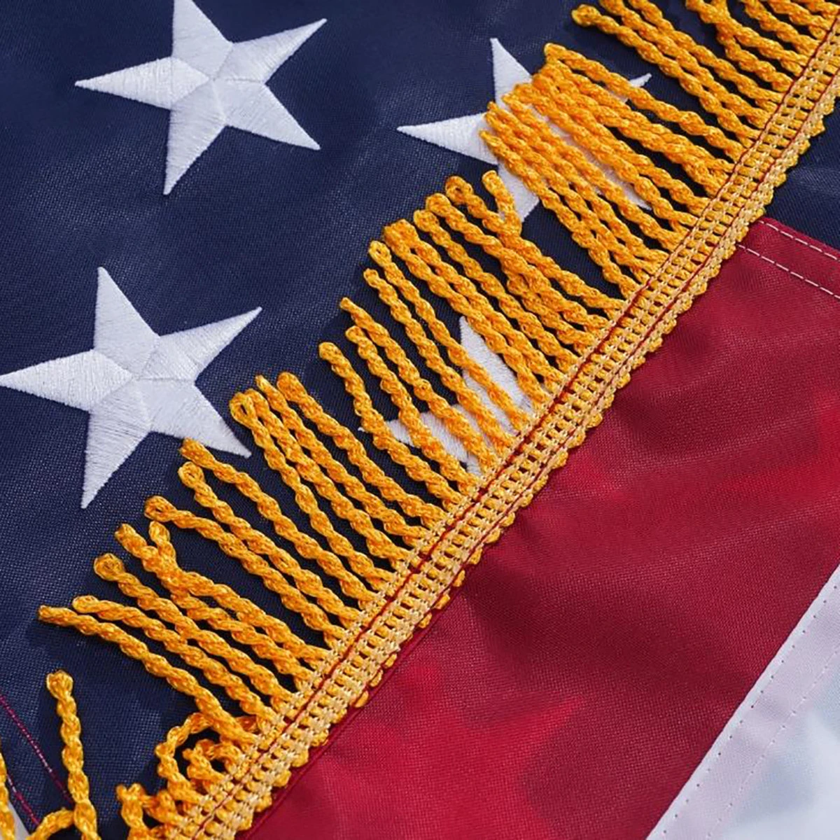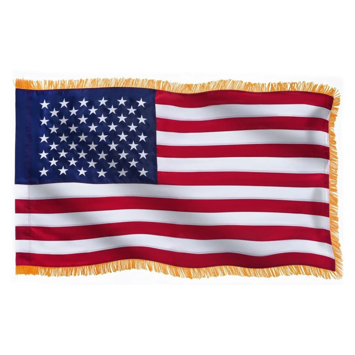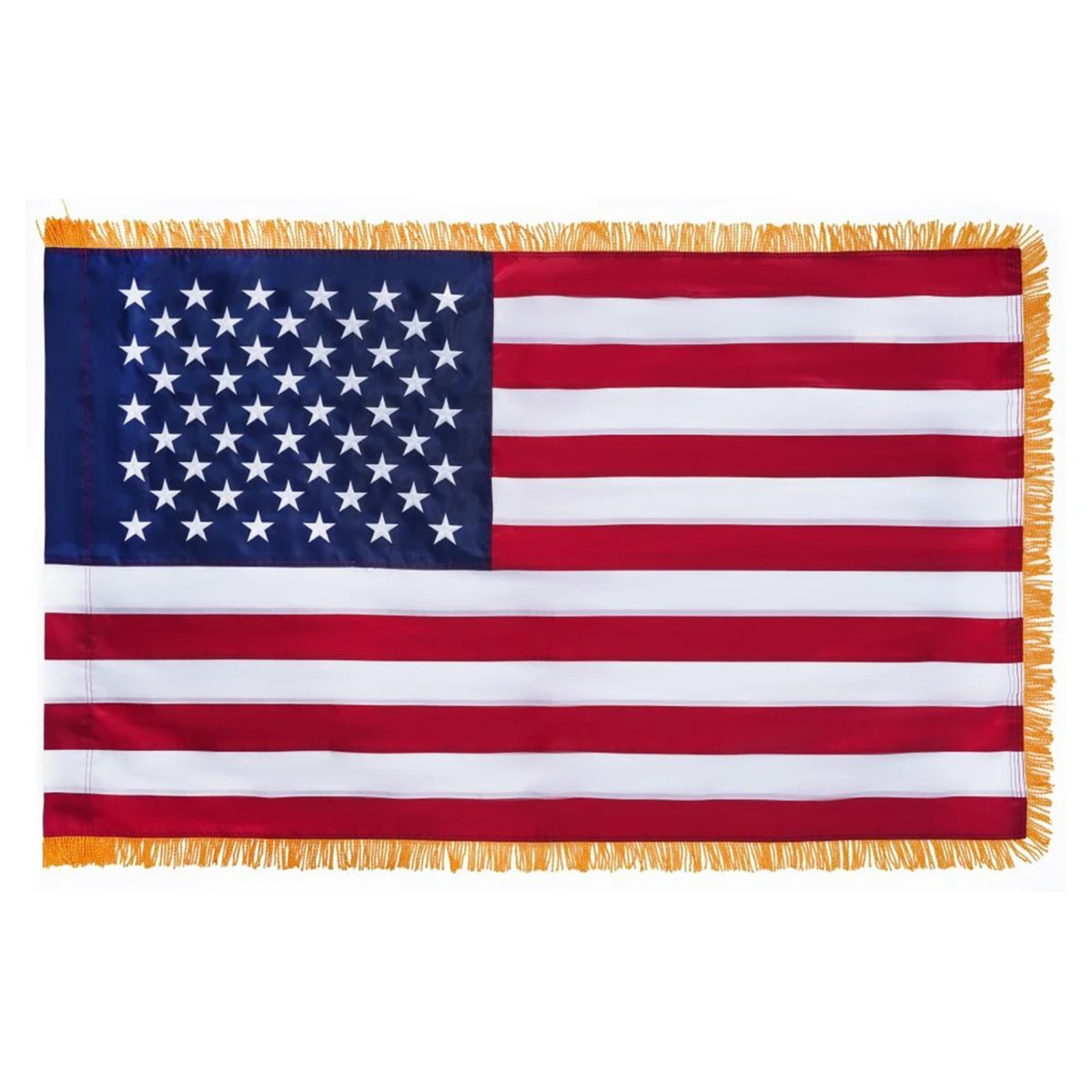 Beautiful 3ft x 5 ft indoor US flag in your 100% weather-resistant nylon fabric. Suitable for indoor and parade use. Embroidered stars and lock-stitched sewn stripes. With Gold Rayon fringe.