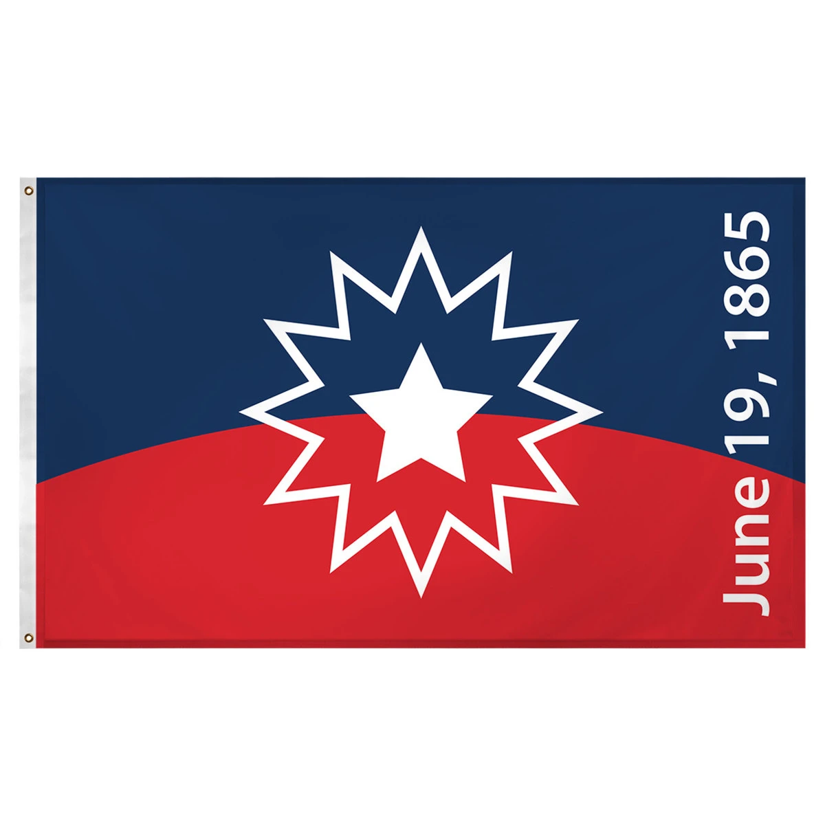 Celebrate an important date in American history June 19th, 1865, the day slavery was abolished, better known as Juneteenth! This 3ft x 5ft Juneteenth flag is made from polyester and is single sided with the image on front shown through to the back. This flag is made using a top quality polyester and is finished with a sturdy header and grommets. Made in China