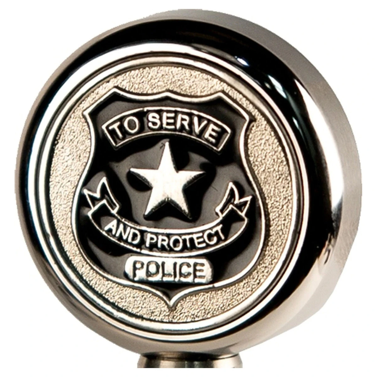 This Police “To Serve & Protect” motorcycle flagpole topper is made of high quality polished stainless steel. Emblem is meticulously crafted and double-sided. This fits any of our motorcycle flagpoles. Measures 1 1/4″ diameter x 1/2″ depth.