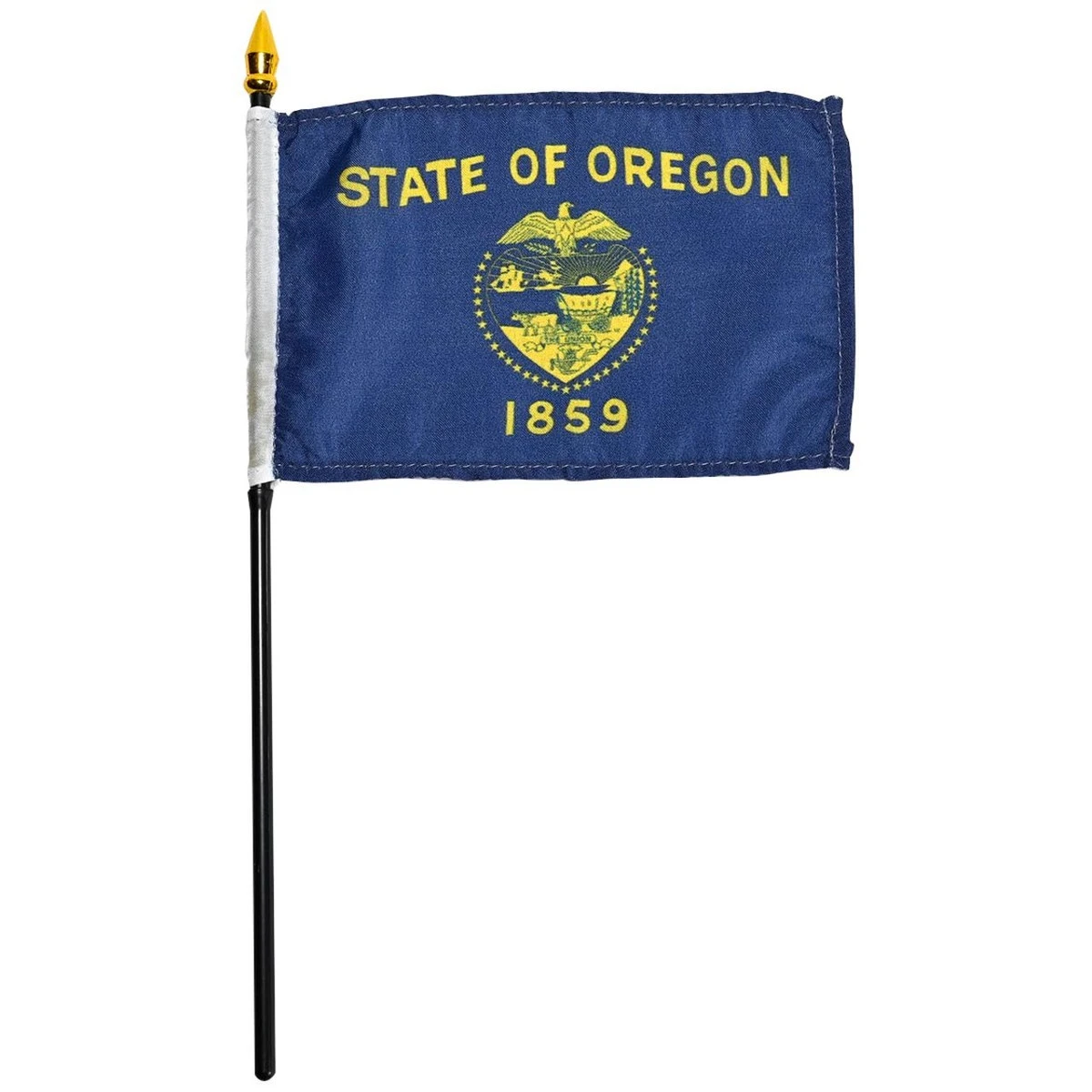 Oregon state stick flag 4 inch x 6 inch, mounted on a 10 inch plastic stick. Flag is made from polyester and printed in bright colors to make an attractive flag. Each flag is individually sewn around the edges.
