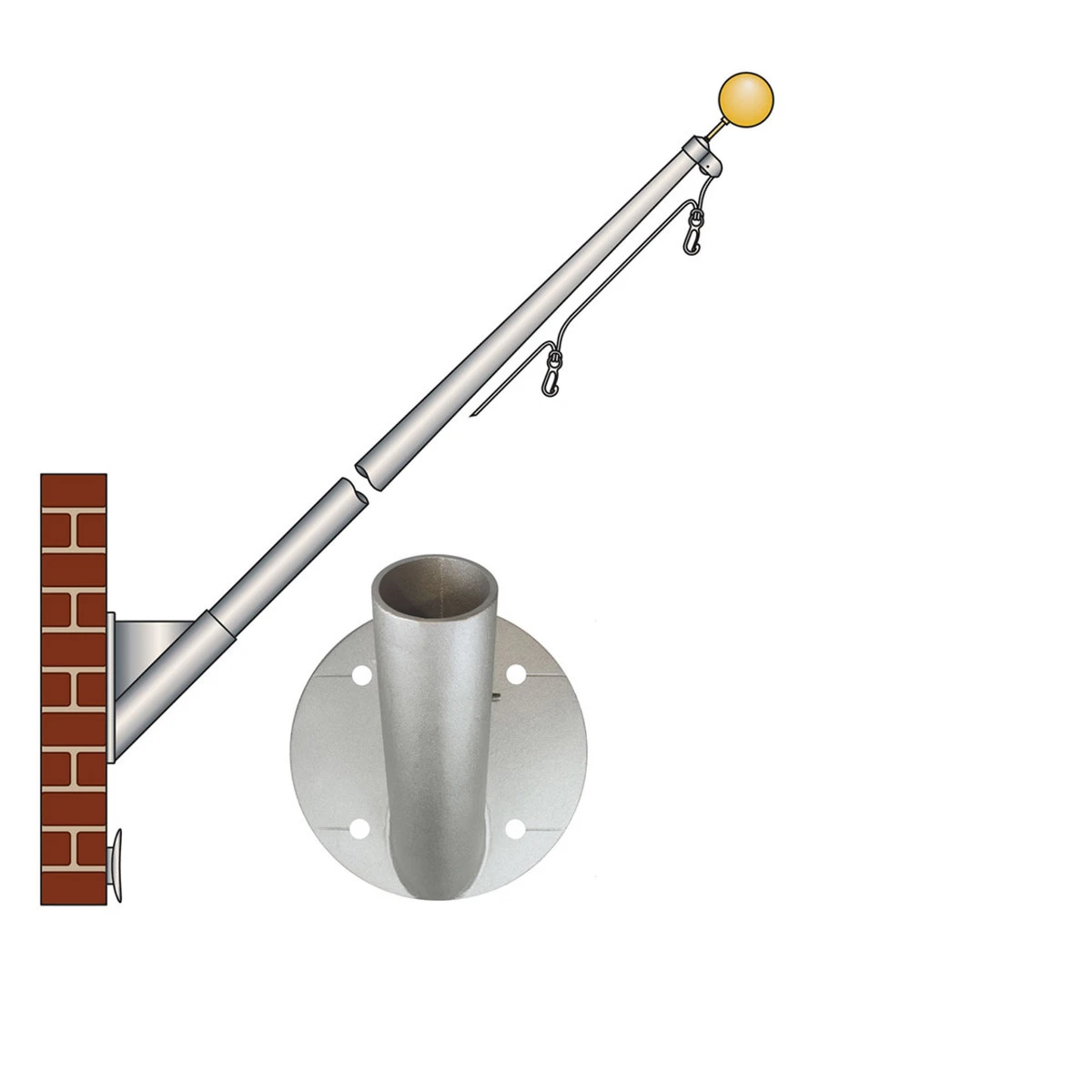 The Outrigger Wall Mount Series flagpole attaches easily to any exterior wall. Use one on your home, your office or your business to display your favorite American, holiday or decorative flag. The heavy-duty wall mount flag pole measures 8 feet long and is ideal for most applications. The pole comes with all necessary mounting hardware for fast installation. A gold anodized aluminum ball ornament is included with the pole.
