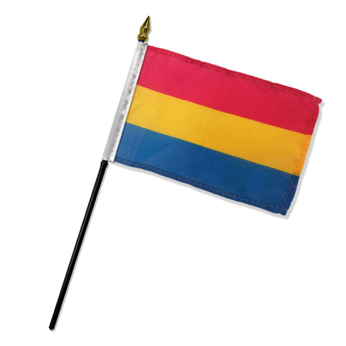 This pansexual 4″ x 6″ stick flag is mounted to a 10.5″ plastic stick and features a metallic golden spear top. The flag is polyester with with bright, bold printed colors. This flag is perfect for decorating, parades, parties and much more.