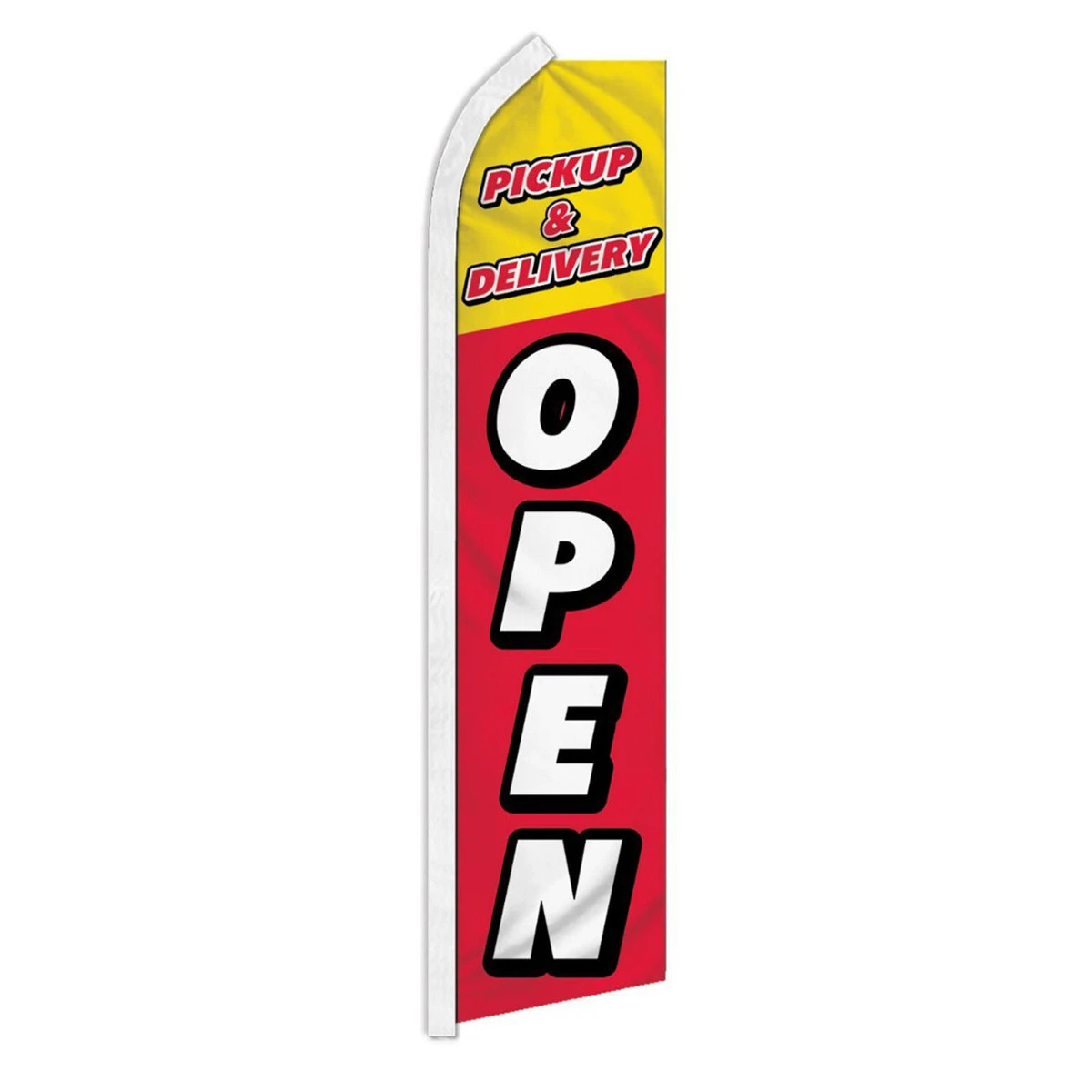 Are you looking for attractive ways to tell people that your business is open for pickup and delivery? Take a look at this Open flag that will let your customers know you are open for pickup and delivery. Get one for your business to make sure that you are noticed! This flag made of a knitted polyester and measures 2.5 ft x 11.5 ft. The reverse side of the flag mirrors the actual design.