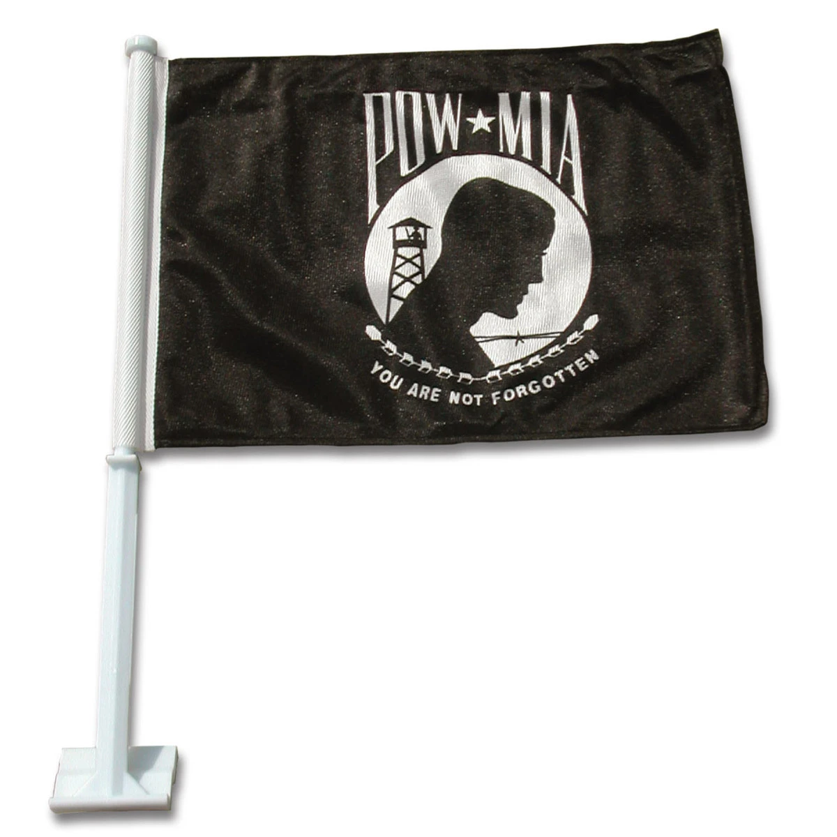 Support the POW/MIA cause with our POW MIA car flags. They’re made of durable, knitted polyester and are double sided for longer life. The staff and window clip are made of nylon.
