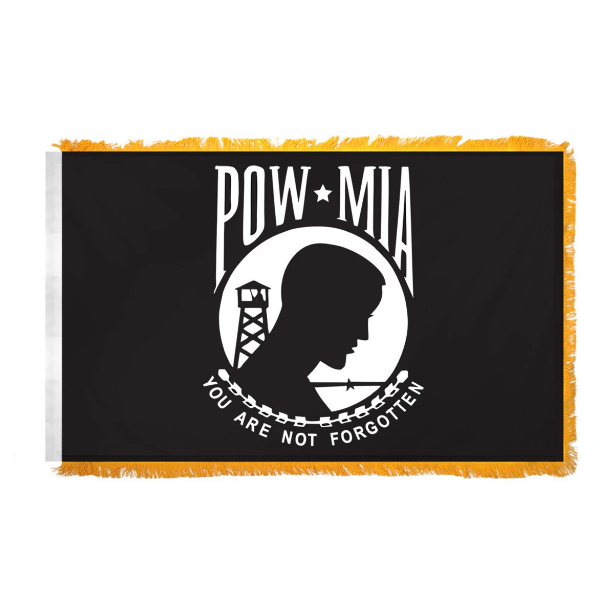 The POW/MIA flag depicts a silhouette of a man’s head with a barbed wire fence and a watchtower in the background. Above the design is the title “POW/MIA,” and below the design the flag bears the motto “You Are Not Forgotten.”