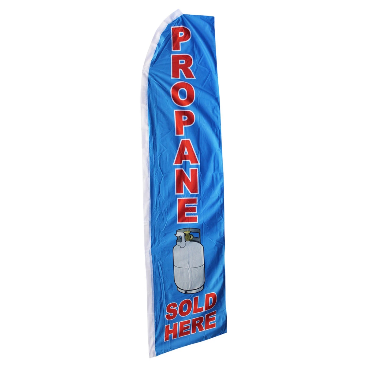 This blue and red Propane Sold Here Flag can be put up outside an authorized filling station. Swooper flags are used to deliver a message just like a banner, but they move like a flag. Made from knitted polyester, the fabric on this blade flag doesn’t wrap around the pole. We also have a wide choice of more advertising flags with generic or specific text, a variety of poles, and bases for your business needs.