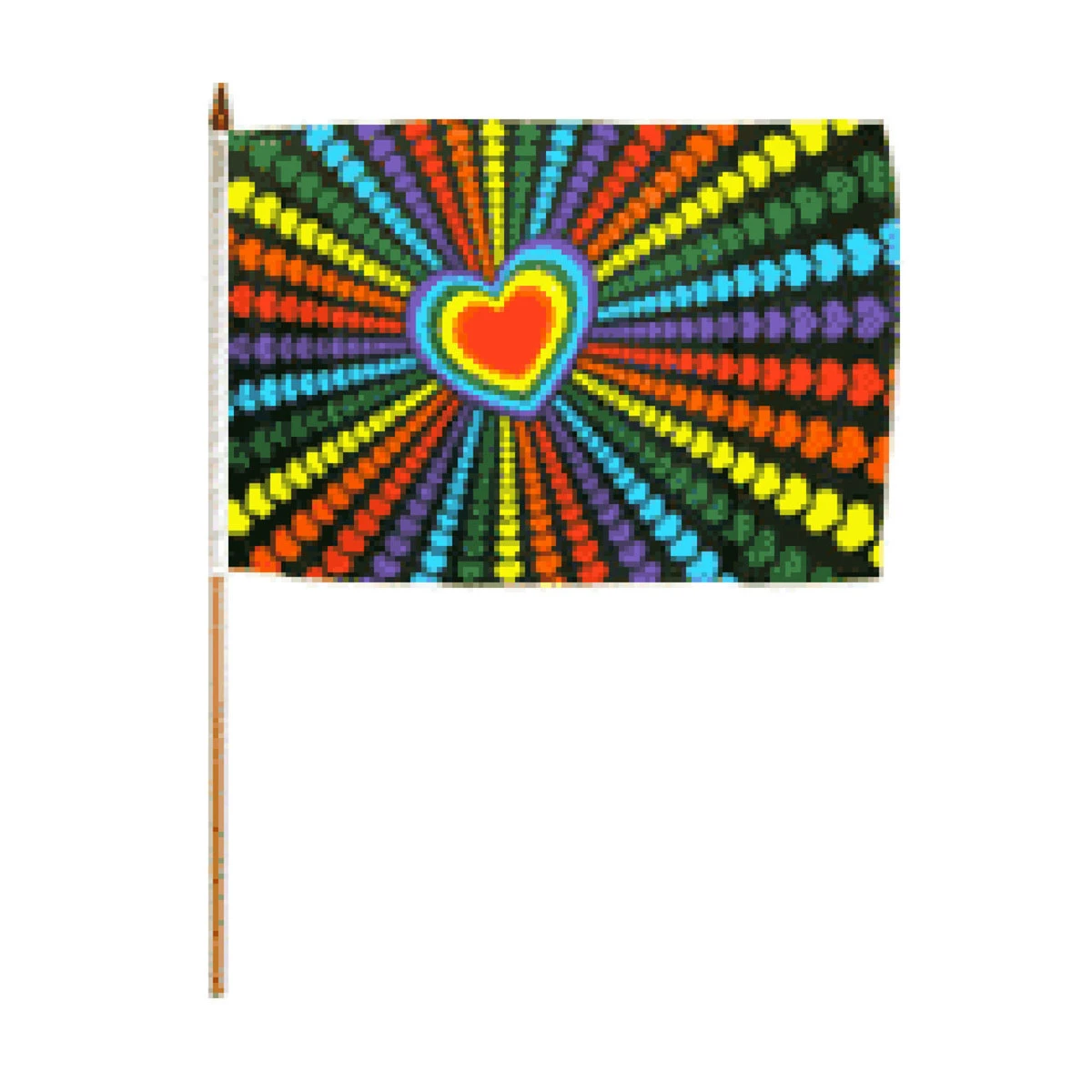 This rainbow love 12″ x 18″ stick flag is mounted to a 24″ wooden stick and features a gold plastic spear topper. The flag is polyester with with bright, bold printed colors. This flag is perfect for decorating, parades, parties and much more.
