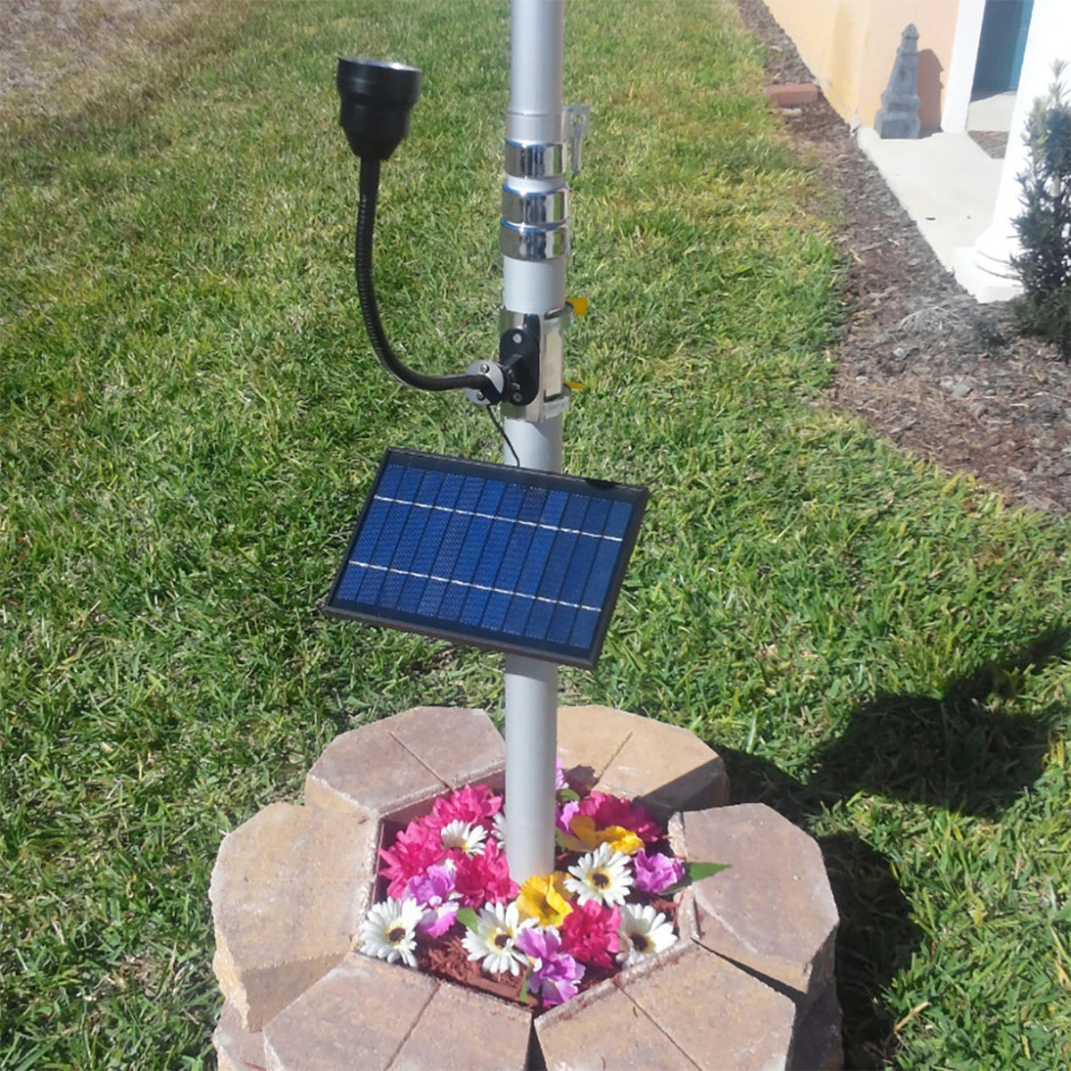 This solar flagpole light comes with a flexible, expandable neck so you can adjust to face any way you want anytime. It comes with a CREE LED light bulbs that can be adjusted from spot light to flood light. It shines up to 80 feet on spotlight mode, when illuminating your flagpole you should set it to flood mode. It will illuminate a flagpole 20ft to 50ft high. It includes hardware to mount up to a 6in diameter flagpole. This light has approximately 600 lumens on the floodlight and 1200 lumens on the spotlight. The solar panel is approximately 6″ x 6″ at 6 watts and 600 mAH.