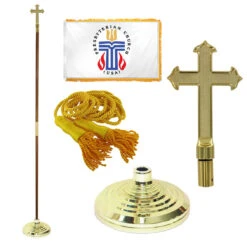 Would you be able to identify the two red symbols that are found on either side of the cross in a Presbyterian Church seal? They represent flames and Scriptures. The white flag has the Presbyterian seal as well as the words Presbyterian Church (USA) printed on it. This nylon flag with gold fringe and a silky finish measures 3 ft x 5 ft. It is accompanied by an oak flag pole, a flag base, and optional cord & tassel. You can choose between a plastic cross or a metal fancy cross topper. It is perfect for indoor use.