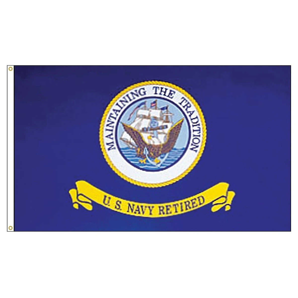 Our US Navy Retired polyester flag is printed on a quality polyester fabric and finished with a sturdy nylon header with two brass grommets. This flag is suitable for indoor and outdoor use. You will not find a better quality printed flag at a lower price!