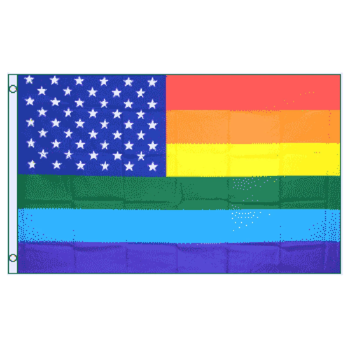 Top quality USA rainbow flag, made from a durable printed polyester. This flag is dye sublimated with beautiful bright colors and they are finished with header tape and grommets. It has double row stitching on all edges and 4 rows of stitching on the flyend.