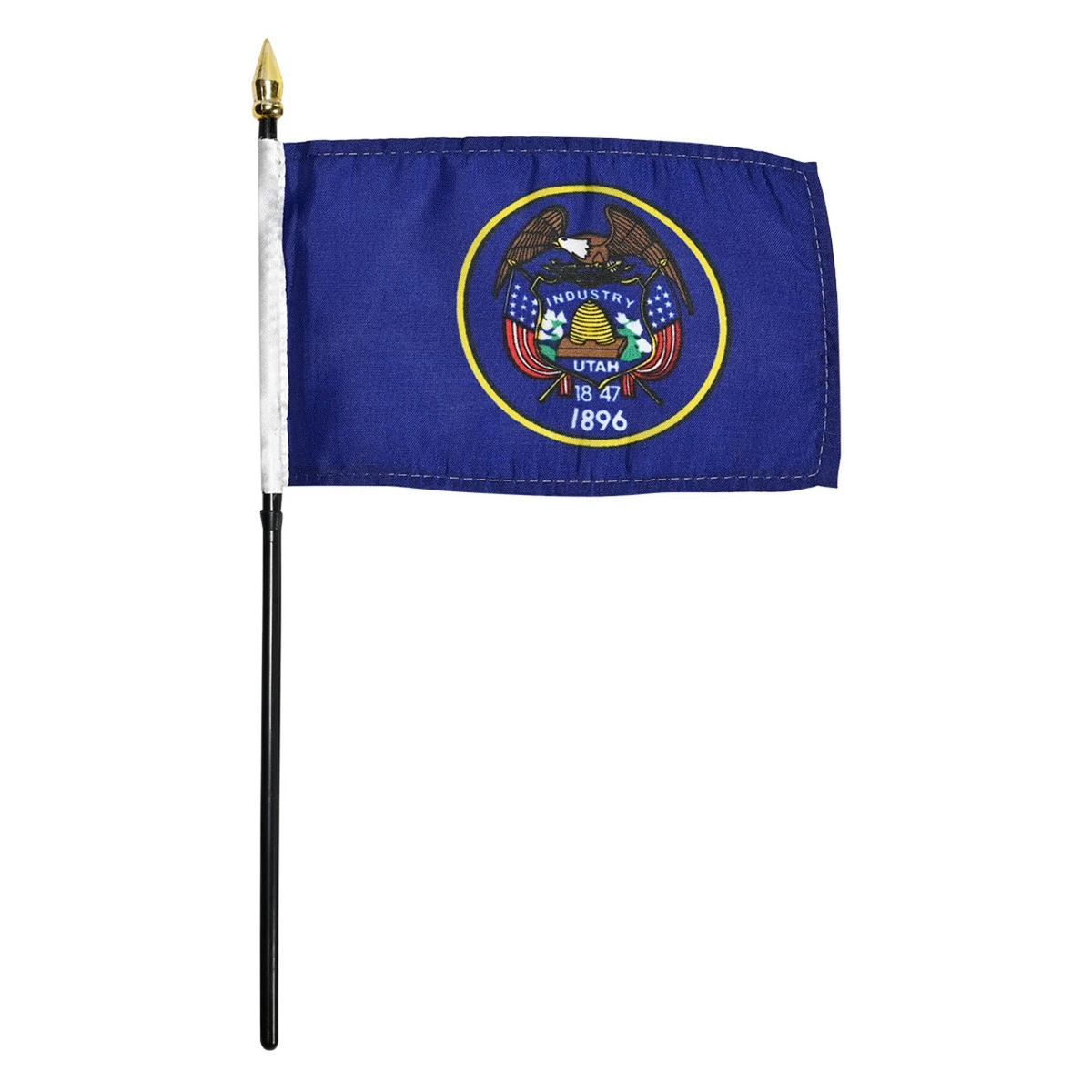 Utah state stick flag 4 inch x 6 inch, mounted on a 10 inch plastic stick. Flag is made from polyester and printed in bright colors to make an attractive flag. Each flag is individually sewn around the edges.