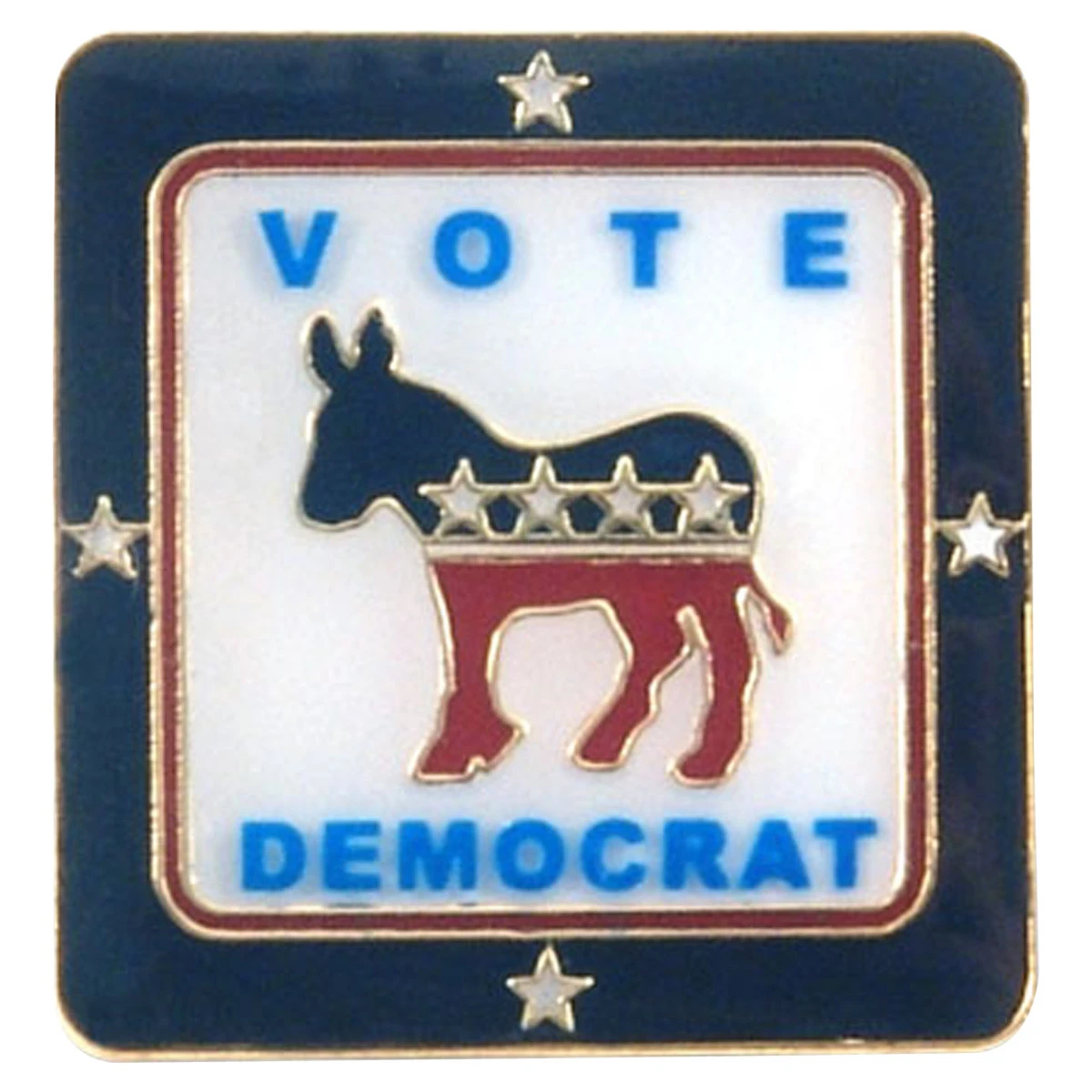 Our Vote Democrat Square Pin features a donkey with an American flag motif, the message “Vote Democrat,” and a blue outline with four stars. Support your political party with this unique pin. All elements of the pin are outlined in a classic gold trim. Our pins cost less than our competitors, but are equal or higher quality. We sell thousands of pins a week, and we pass the savings on to you!