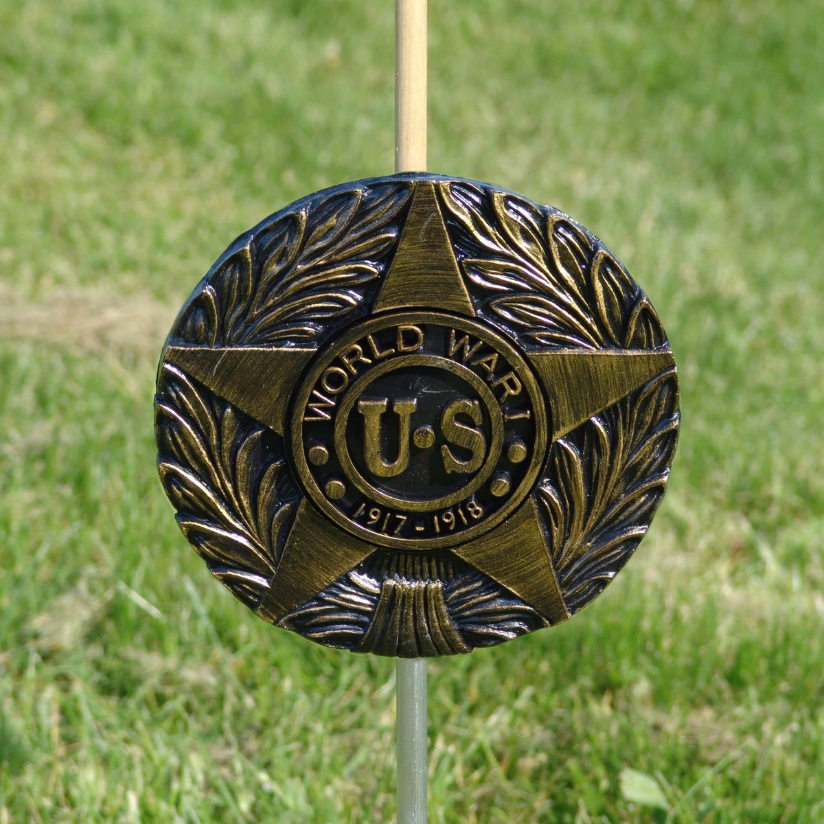 This World War I Grave Marker is made of thermoplastic and has been permanently antiqued and highlighted in bronze with a protective clear over coat. It comes complete with a 3/8″ x 18″ silver aluminum rod for for easy in-ground display. There is a rear flag holder that will accept up to a 3/8″ diameter staff. This grave marker is a beautiful way to honor your loved ones.